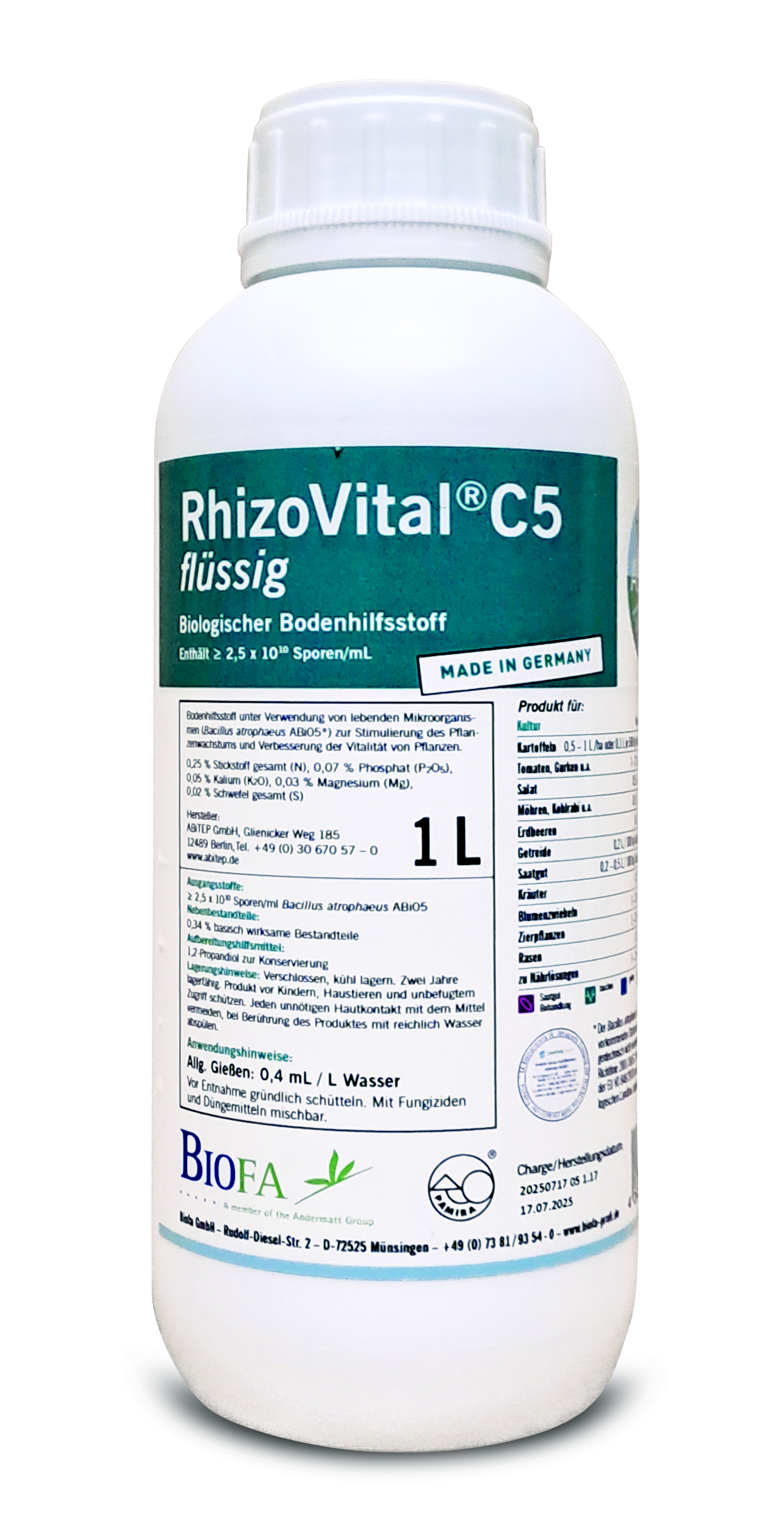 RhizoVital C5 ist ein Bodenhilfsstoff, der gezielt die natürlichen Prozesse im Boden fördert. Mit einer hochwirksamen Konzentration von Sporen des Bodenbakteriums Bacillus atrophaeus Abi05 (2,5 x 10¹⁰ cfu/ml) bietet RhizoVital C5 zahlreiche Vorteile für Ihre Pflanzen.