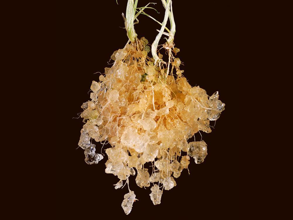 Ein vernetztes Copolymer auf Kaliumbasis. Es dient zur Speicherung von Wasser und Nährstoffen.