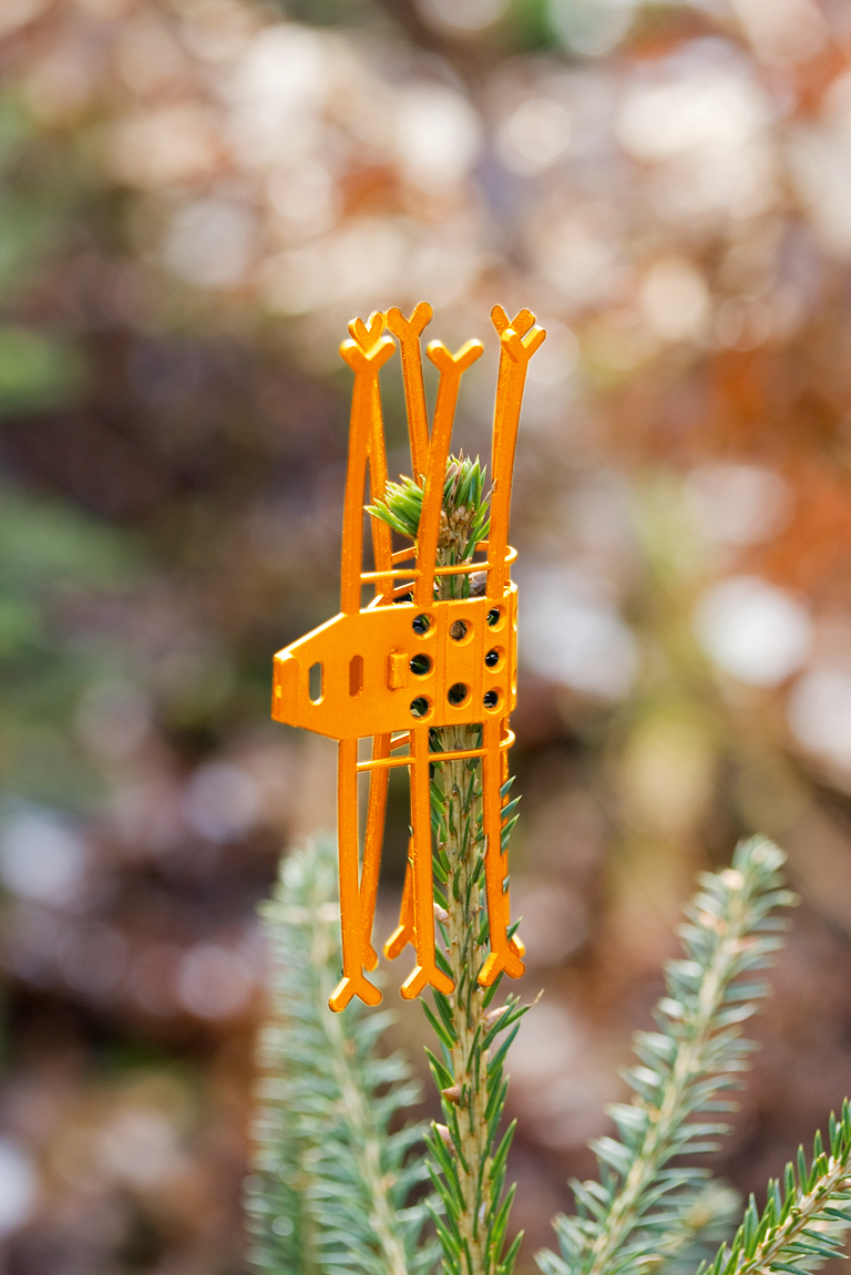 Mechanischer, ganzjähriger Verbissschutz für Nadelhölzer aus flexiblem UV-stabilisierten PE. Der Terminalschutz „CACTUS“ wird direkt unterhalb der Terminalknospe montiert. Die innenliegenden kurzen Stacheln fixieren den Clip am Terminaltrieb, die nach oben und unten weit überstehenden festen, langen Stacheln schützen gegen Verbiss und Abbiss, die äußeren am Umfang befindlichen Stacheln gegen Zubeißen und mögliches Abziehen des Clips vom Terminaltrieb. Nach jährlichem Abschluss der Wachstumsphase muss der Terminalschutz „CACTUS“ geöffnet und wieder direkt unter die neu geschobene Terminalknospe gesetzt werden. Häufig ist jedoch auch ein einfaches Verschieben des „CACTUS“ entlang des Triebes bis unter die Terminalknospe möglich.